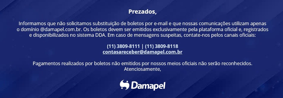 Informamos que não solicitamos substituição de boletos por e-mail e que nossas comunicações utilizam apenas o domínio @damapel.com.br. Os boletos devem ser emitidos exclusivamente pela plataforma oficial e, registrados e disponibilizados no sistema DDA. Em caso de mensagens suspeitas, contate-nos pelos canais oficiais: